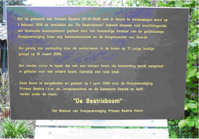 Om de geboorte van Prinses Beatrix (31-01-1938) ook in Hoorn te vereeuwigen werd op 1 februari 1938 de inmiddels als “De Beatrixboom” bekend staande niet vruchtdragende, wit bloeiende kastanjeboom gepland door het toenmalige bestuur van de gelijknamige Oranjevereniging (toen nog feestcommissie) en de burgemeester van Heerde.